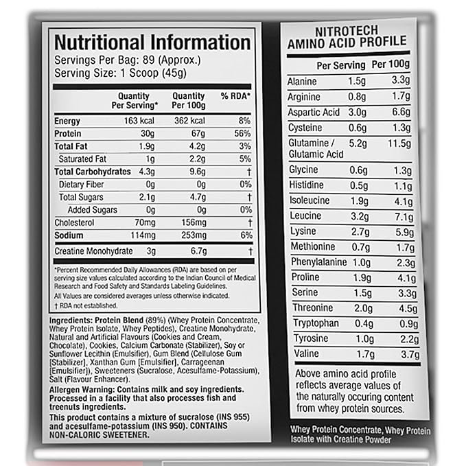 - PROTEIN POWDER for MUSCLE GAIN – In a 6-week, double-blind study involving the core ingredients of Nitro-Tech, subjects gained 70% more lean muscle than those using regular whey (8.8 vs 5.1 lbs) and increased their bench press more (34 vs 14 lbs). Notice: Use this product as a food supplement only. Do not use for weight reduction